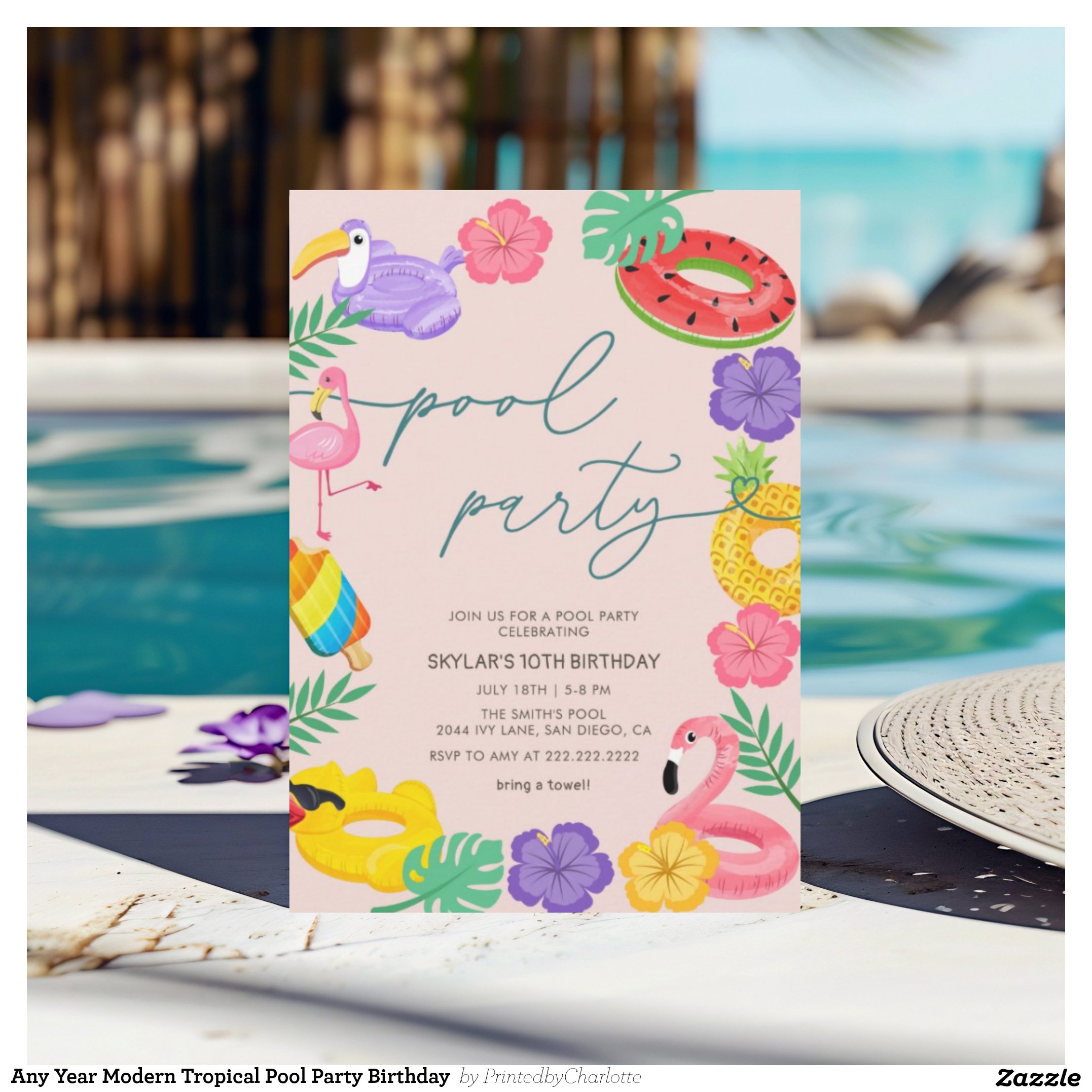 Any Year Modern Tropical Pool Party Birthday Invitation