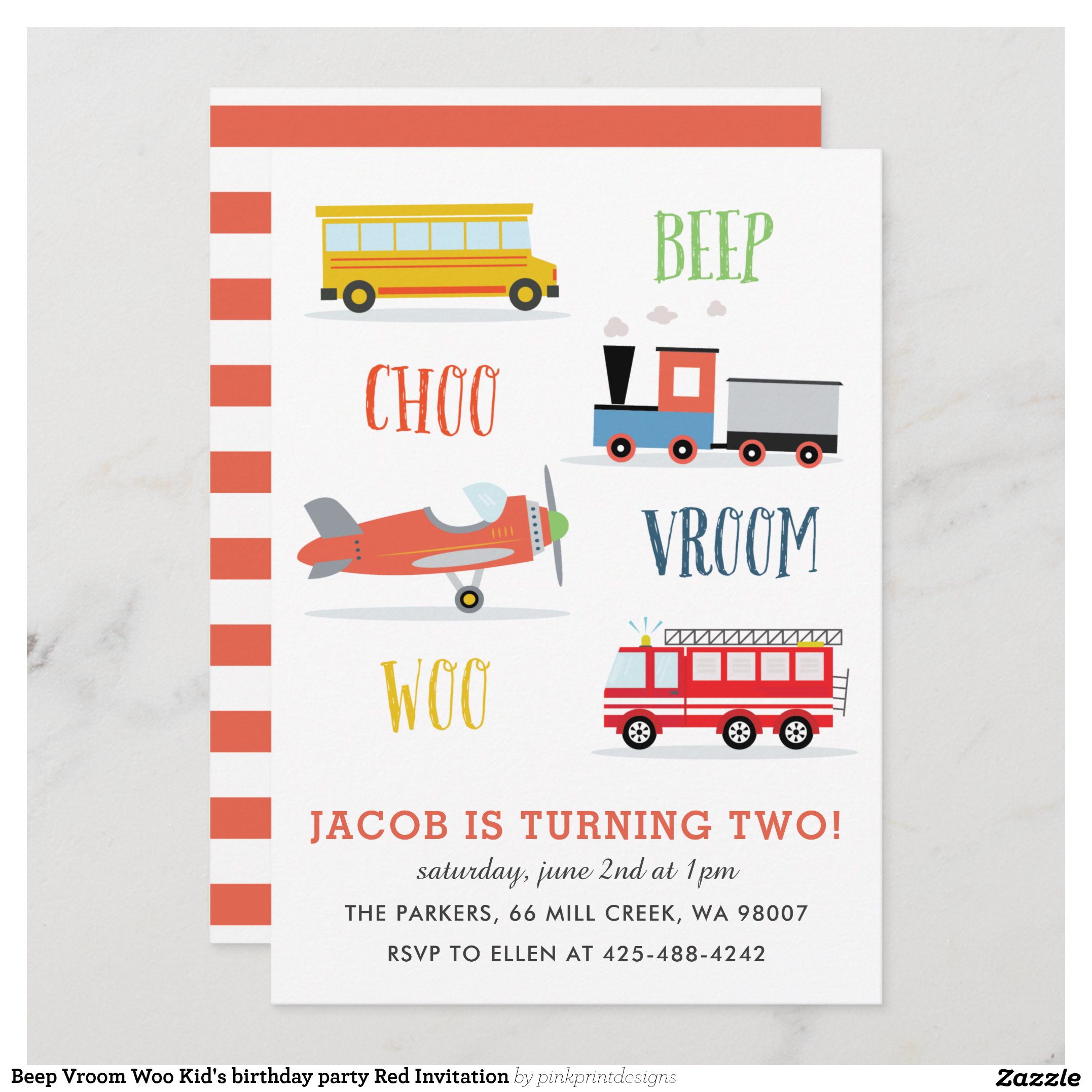 Beep Vroom Woo Kid’s birthday party Red Invitation