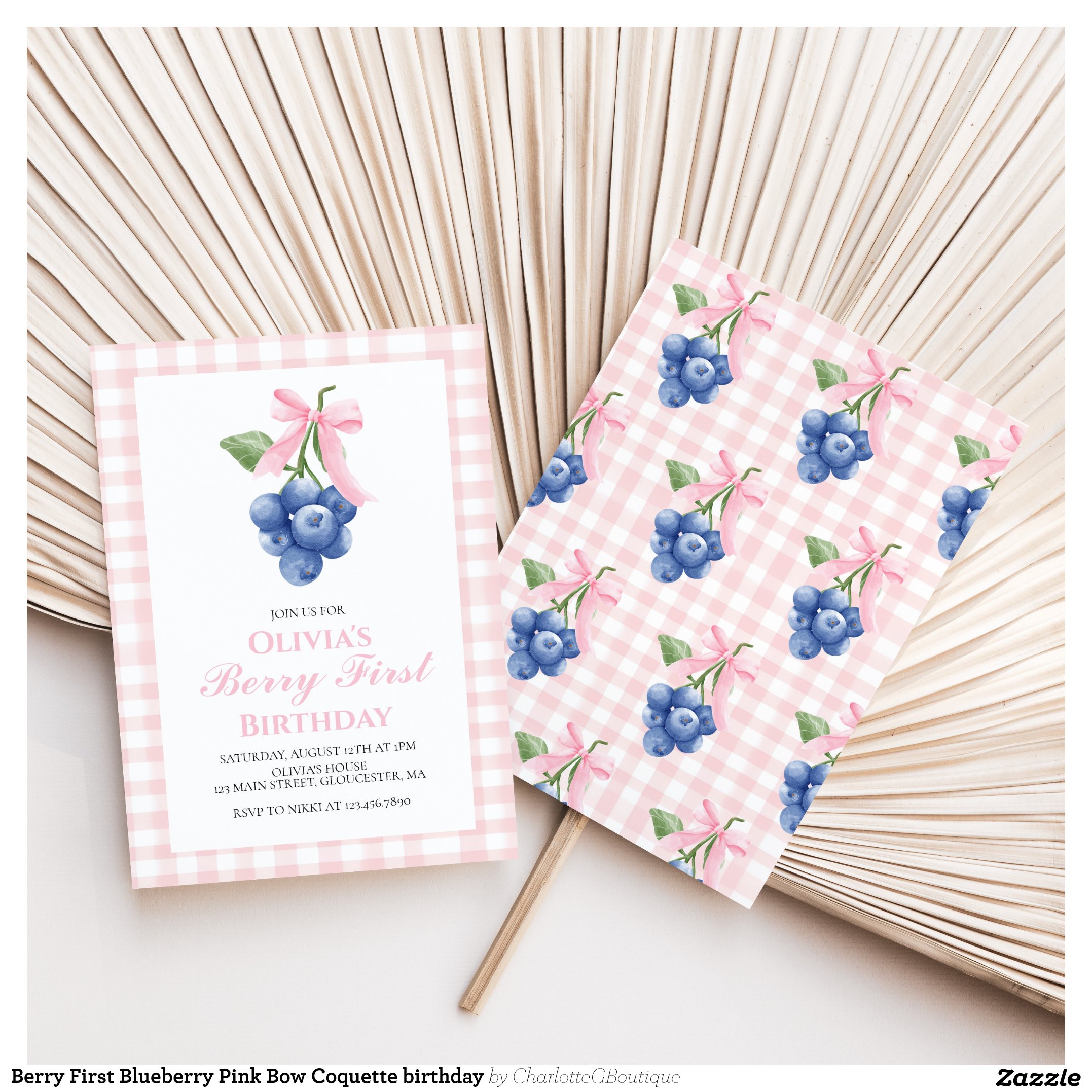 Berry First Blueberry Pink Bow Coquette birthday Invitation