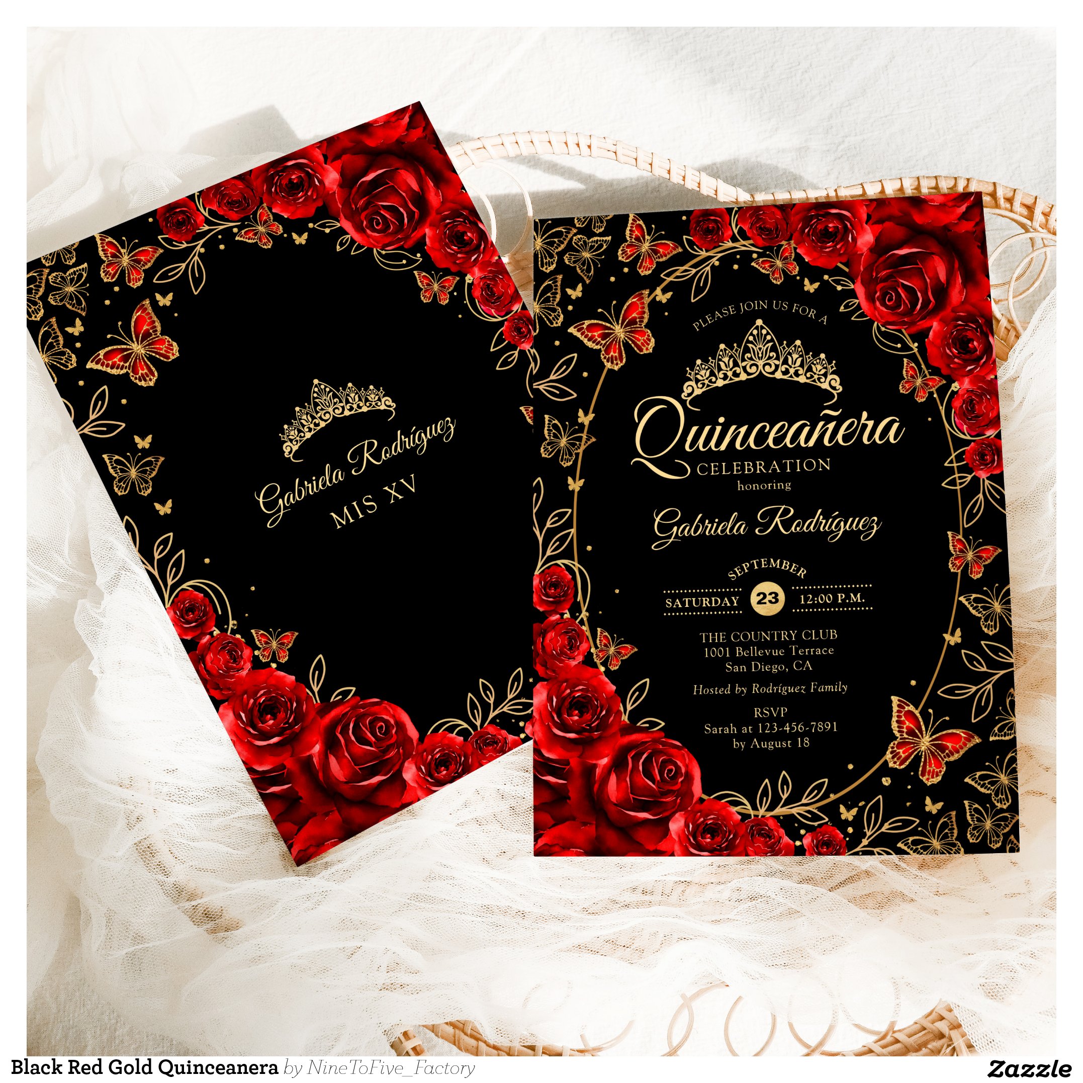 Be the first to review “Black Red Gold Quinceanera Invitation”