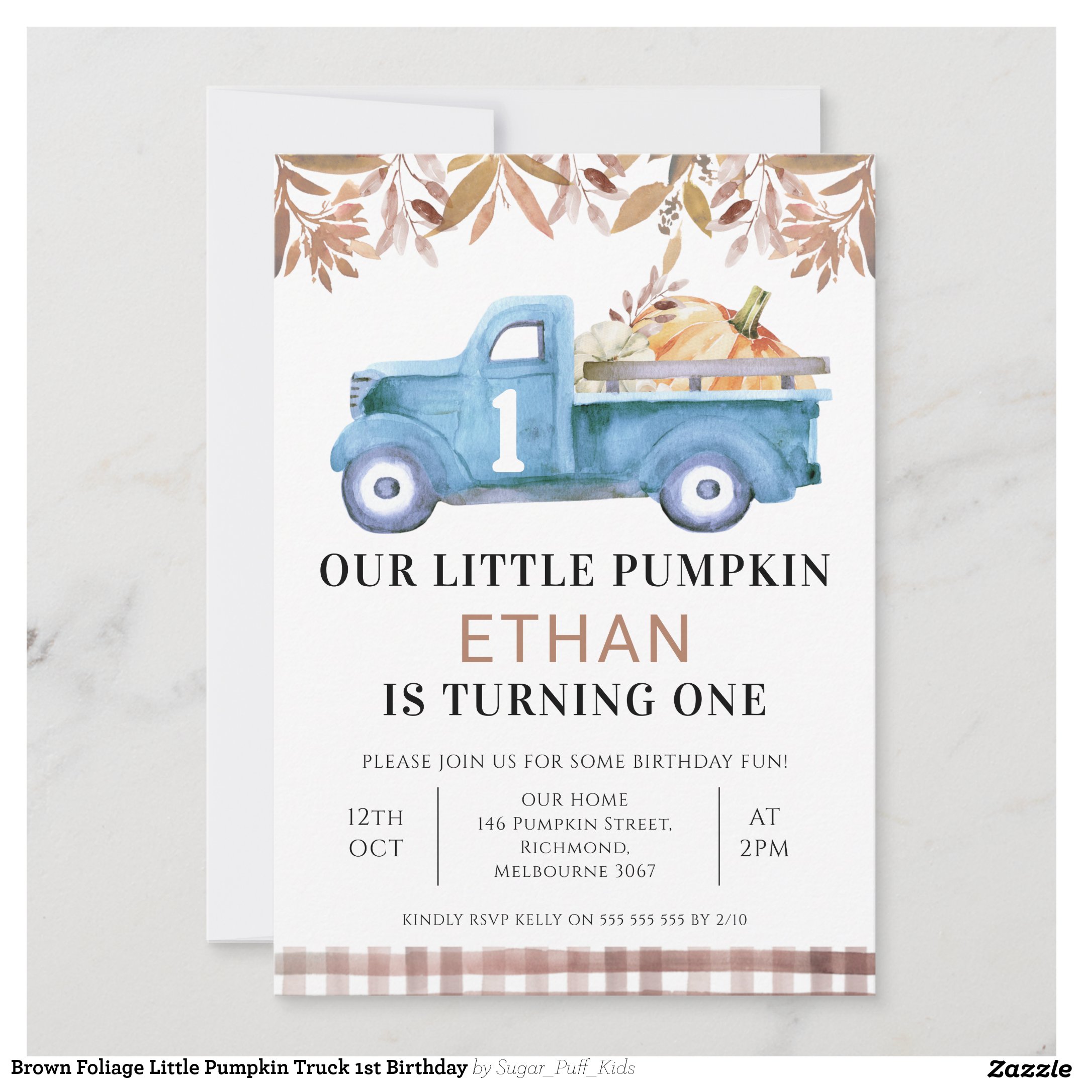 Brown Foliage Little Pumpkin Truck 1st Birthday Invitation