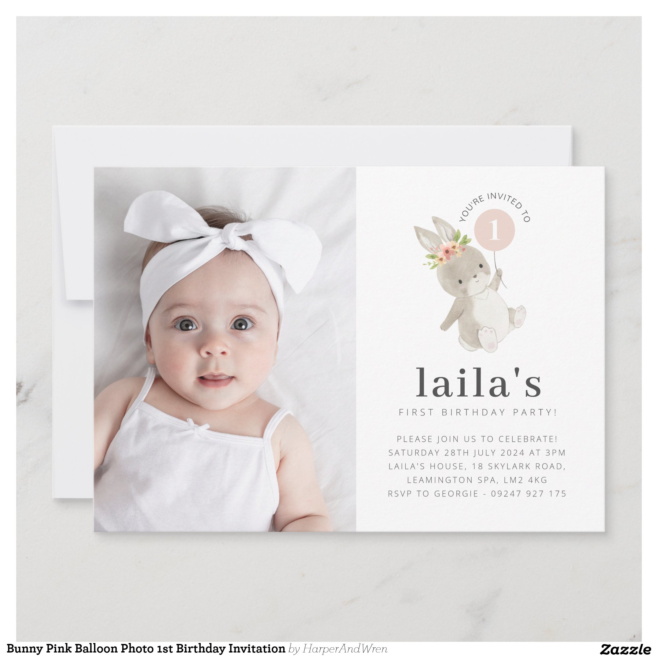 Bunny Pink Balloon Photo 1st Birthday Invitation