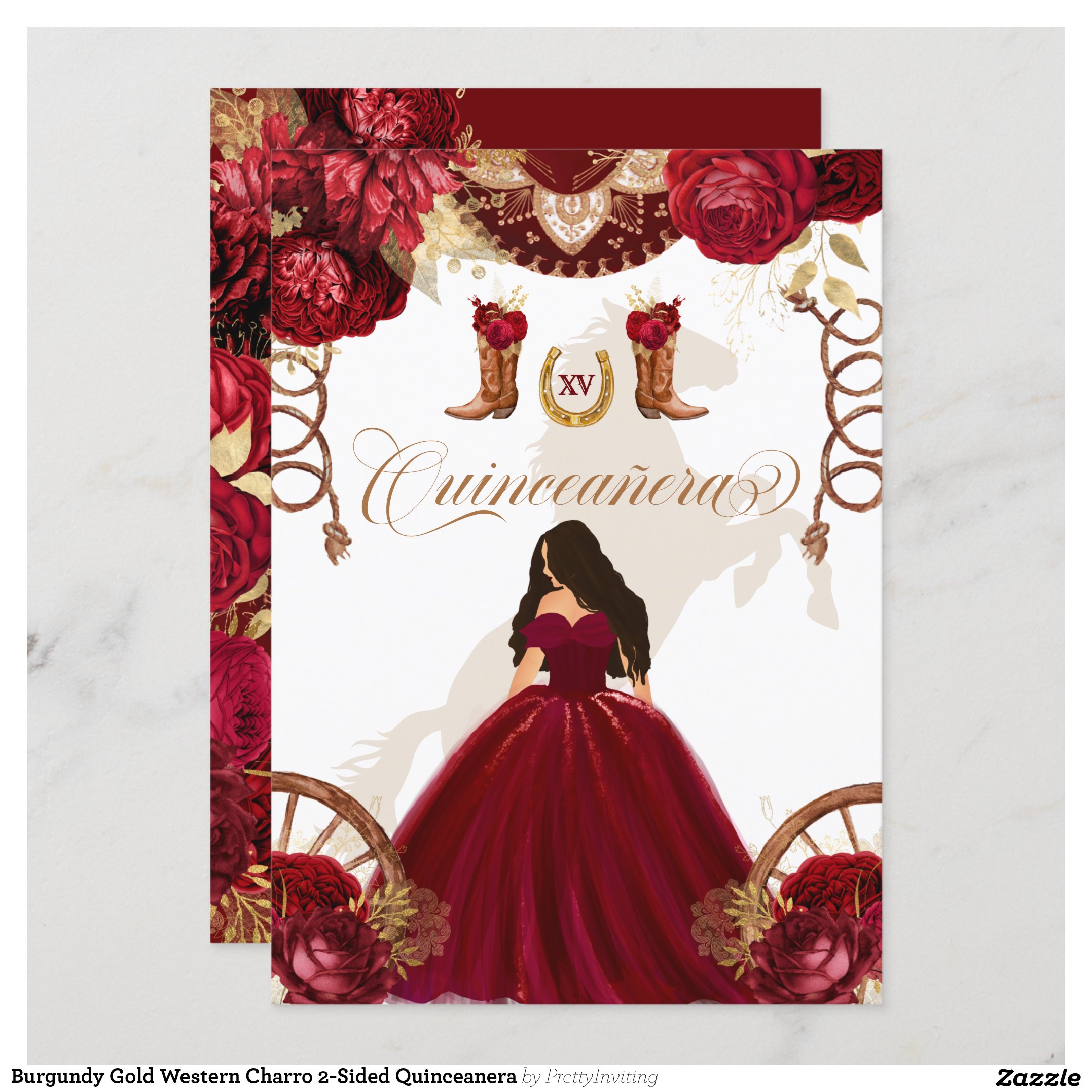 Burgundy Gold Western Charro 2-Sided Quinceanera Invitation