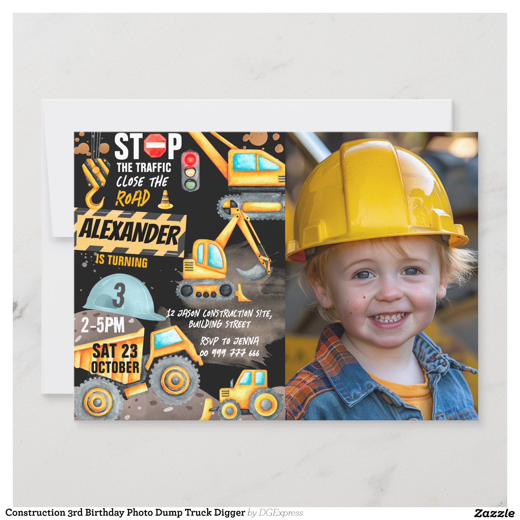 Construction 3rd Birthday Photo Dump Truck Digger Invitation