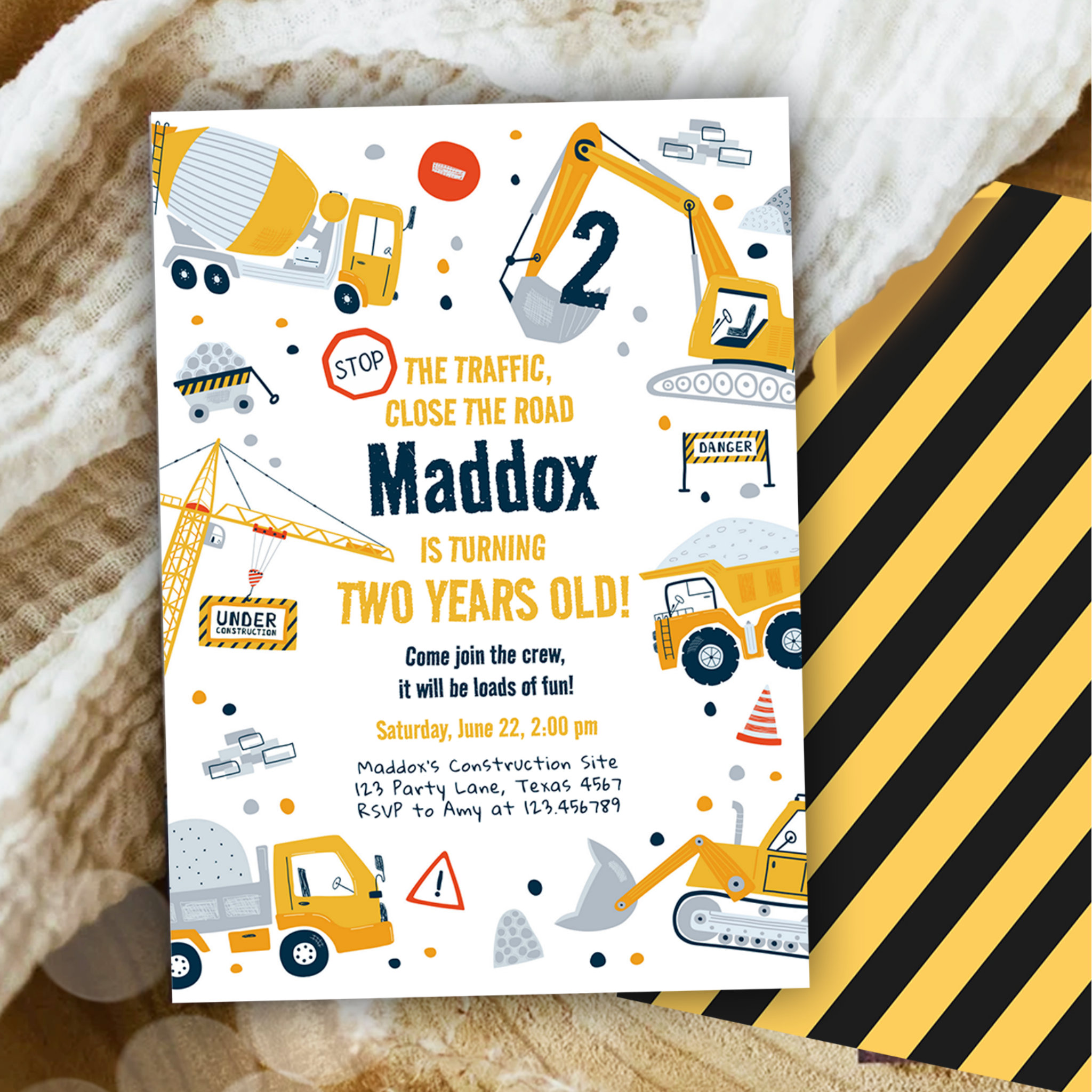 Construction Yellow Dump Truck Digger Boy Birthday Invitation