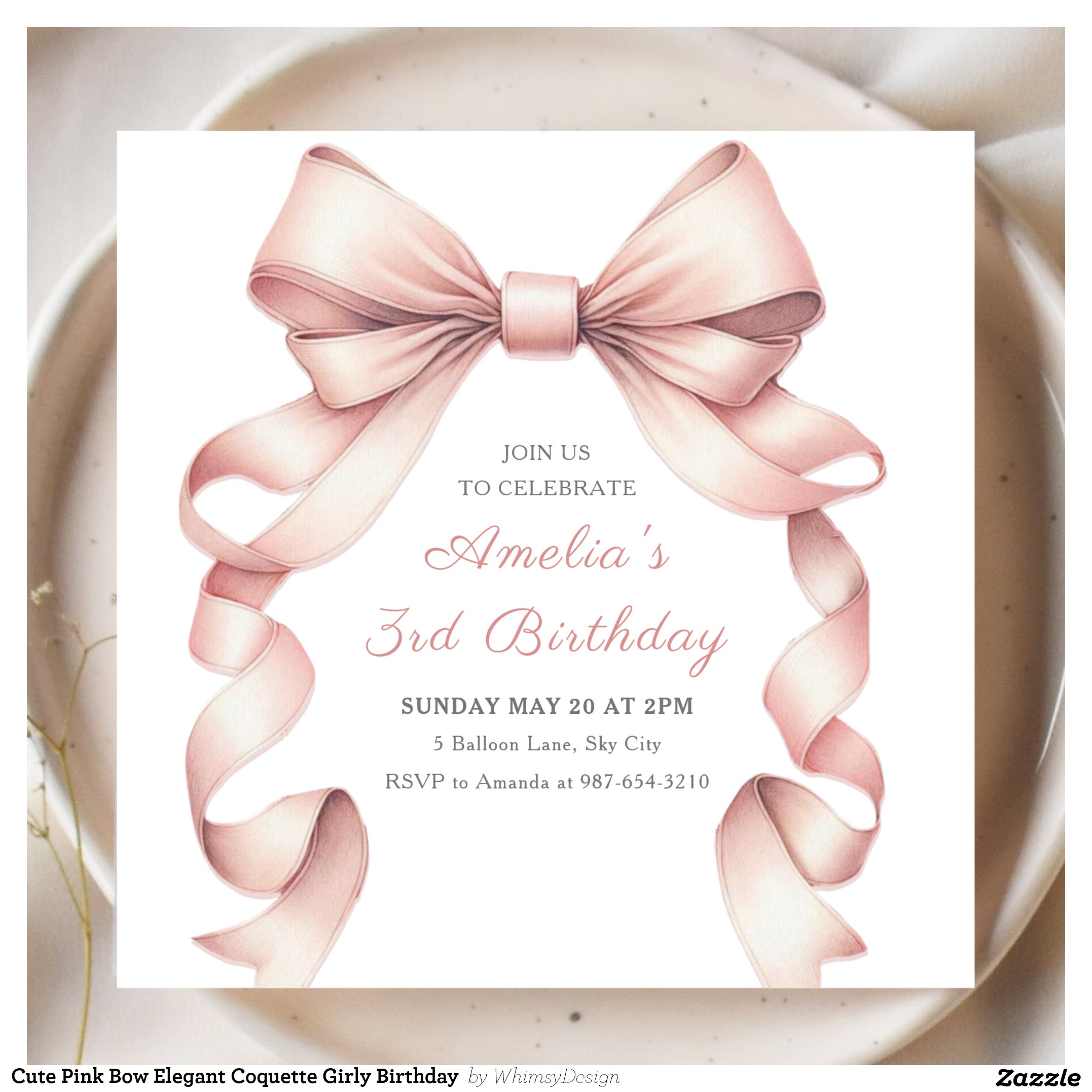 Cute Pink Bow Elegant Coquette Girly Birthday Invitation