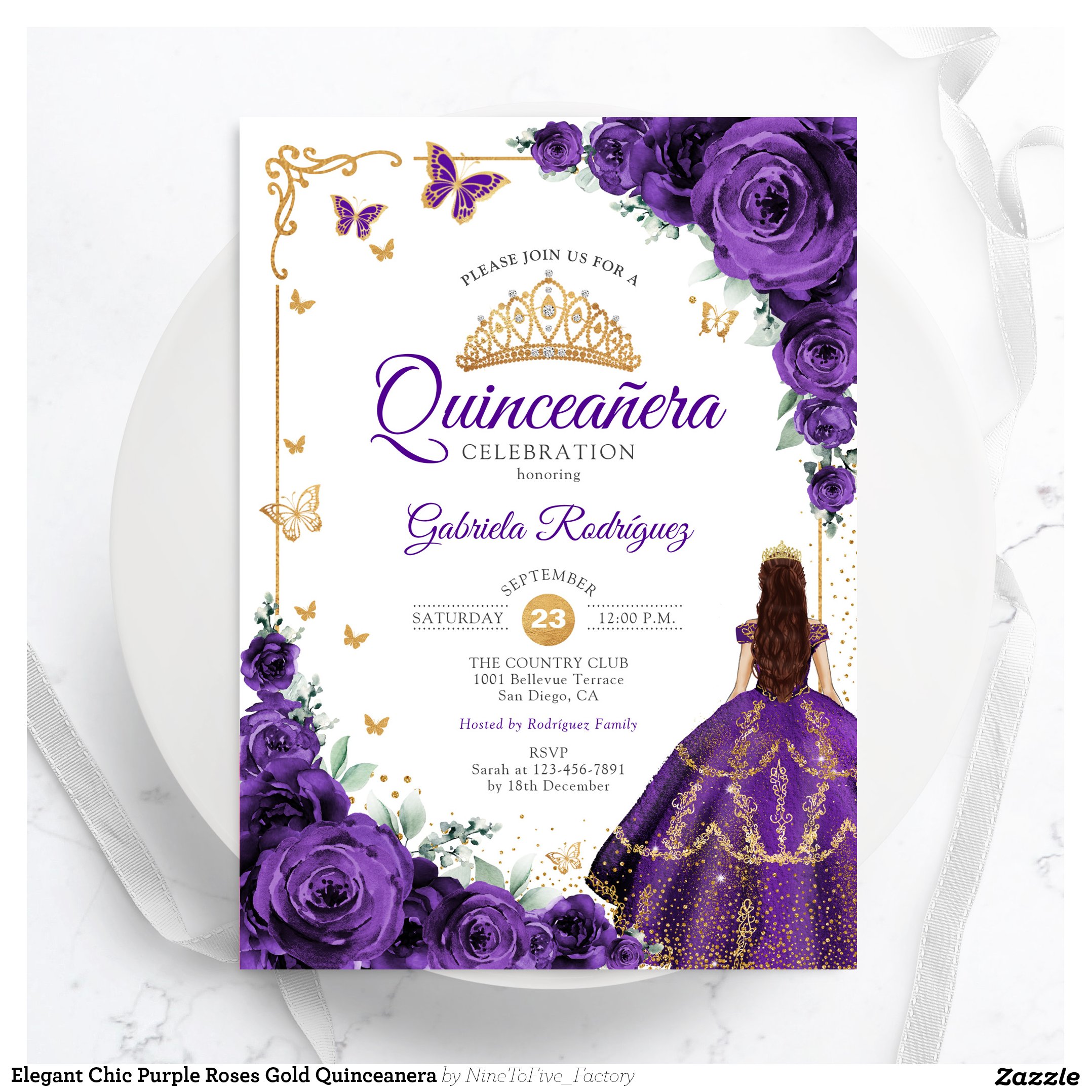 Elegant Chic Purple Roses Gold Quinceanera Invitation