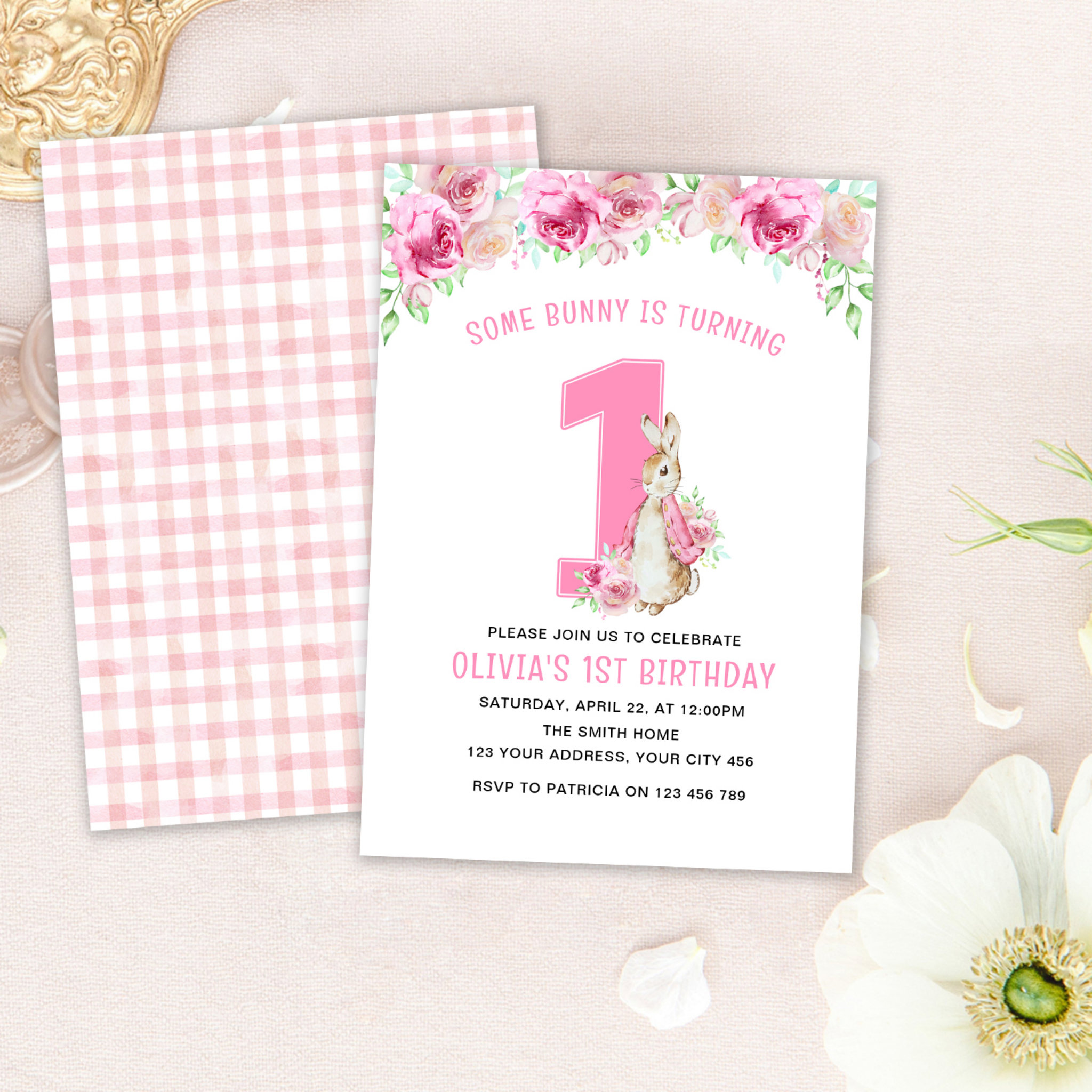 Flopsy Rabbit 1st Birthday Pink Floral Invitation