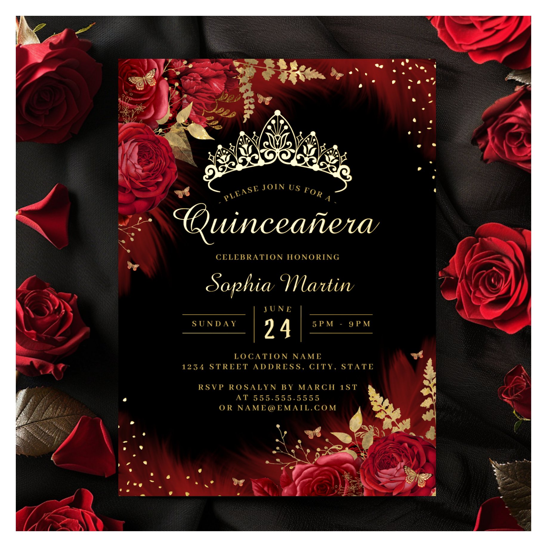 Be the first to review “Gold Red Butterfly Floral Quinceanera Foil Invitation”