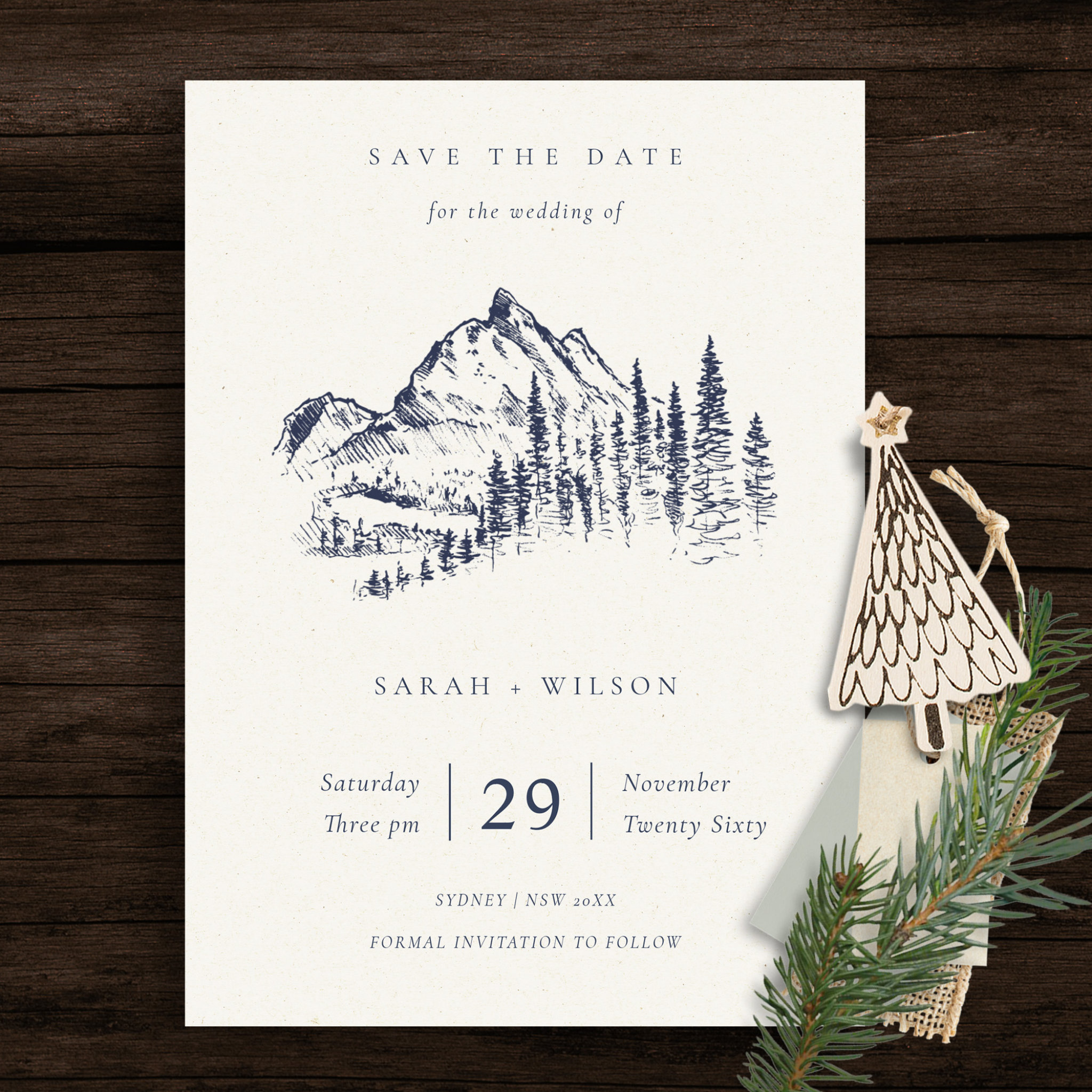Be the first to review “Navy Pine Mountain Sketch Save The Date Card”