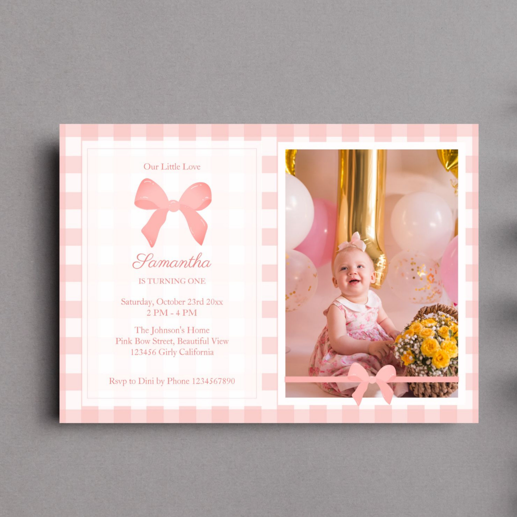 Be the first to review “Pink Gingham Pink Bow Birthday Photo Invitation”