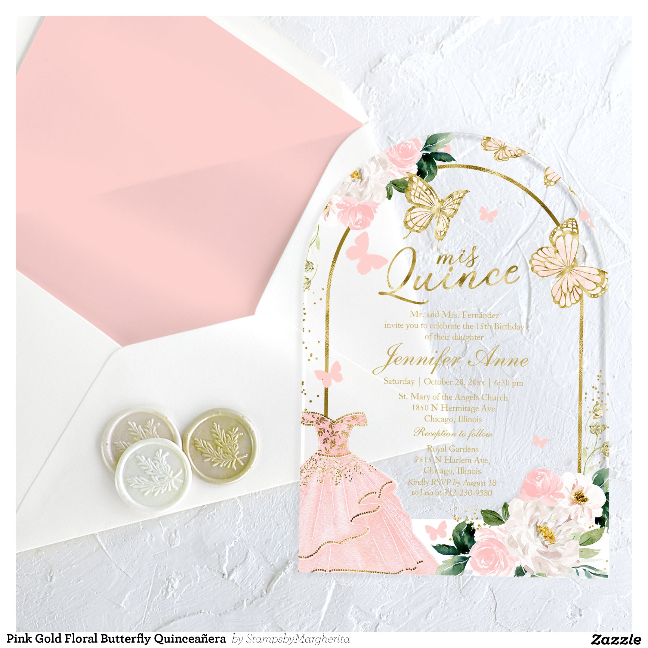 Pink Gold Floral Butterfly Quincea?era Acrylic Invitations