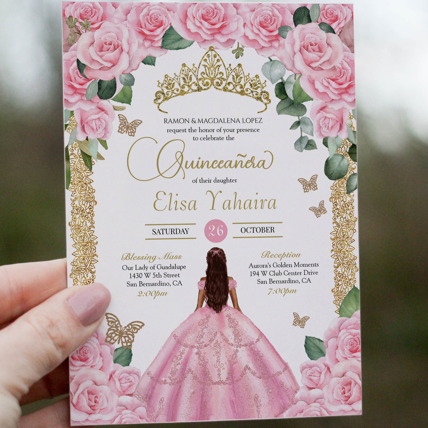 Pink Rose & Gold Butterfly Quinceanera Invitation