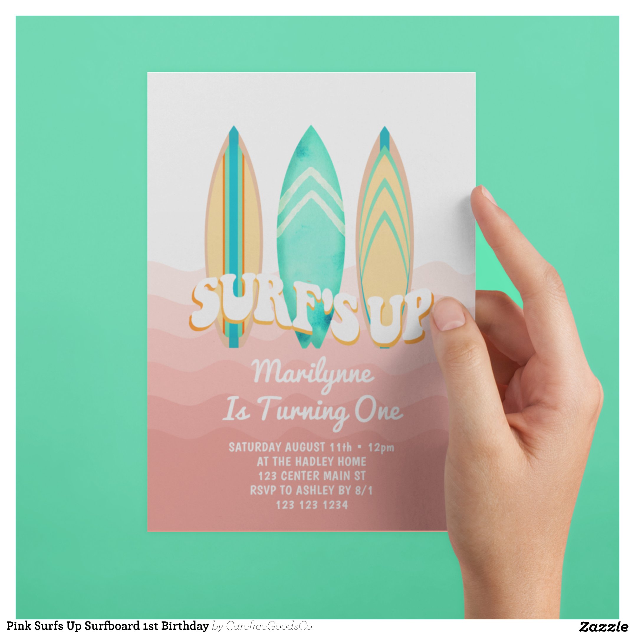 Pink Surfs Up Surfboard 1st Birthday Invitation