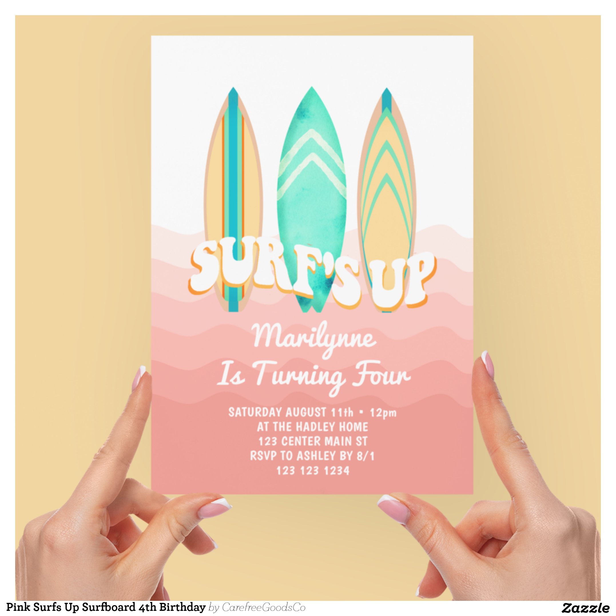 Pink Surfs Up Surfboard 4th Birthday Invitation