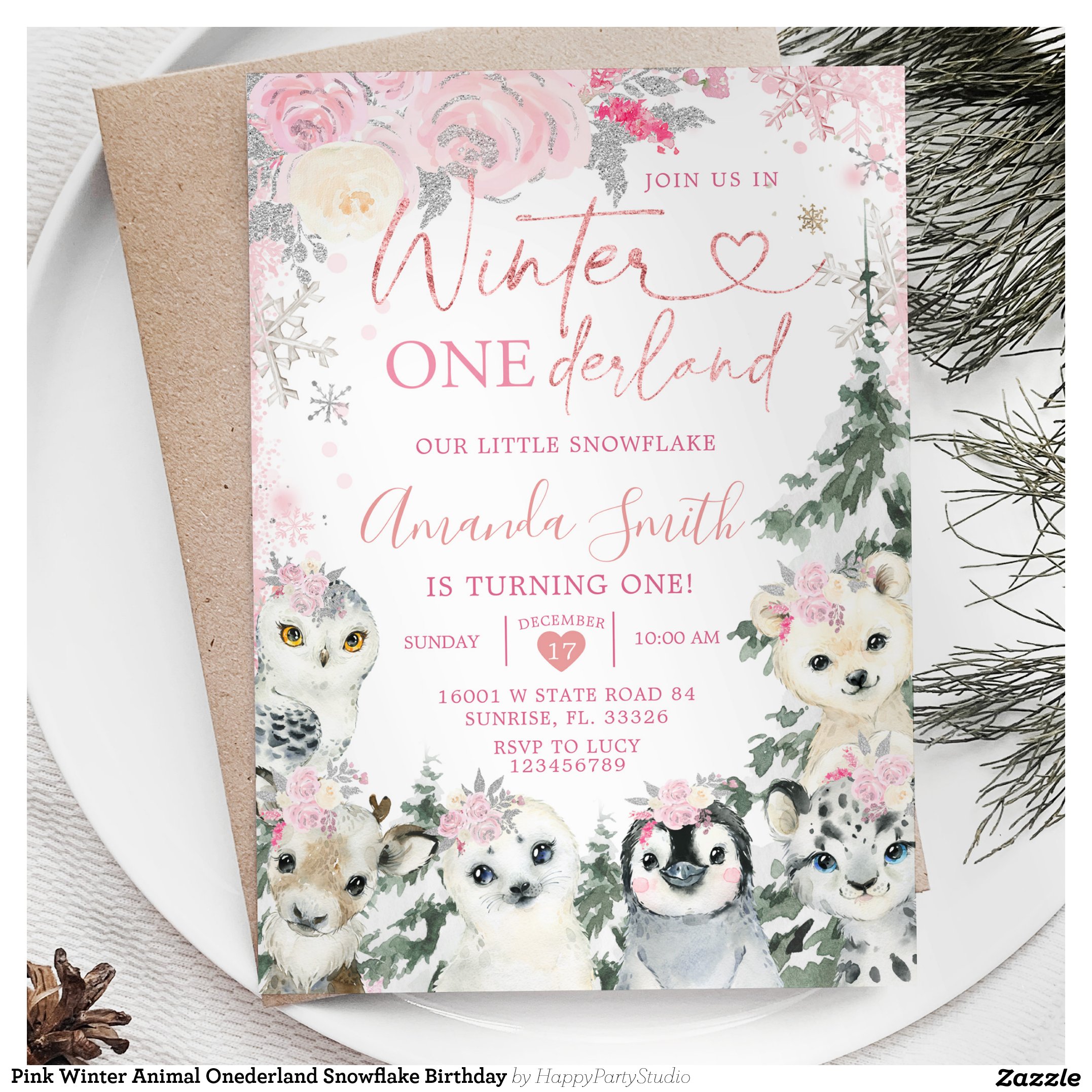 Pink Winter Animal Onederland Snowflake Birthday Invitation