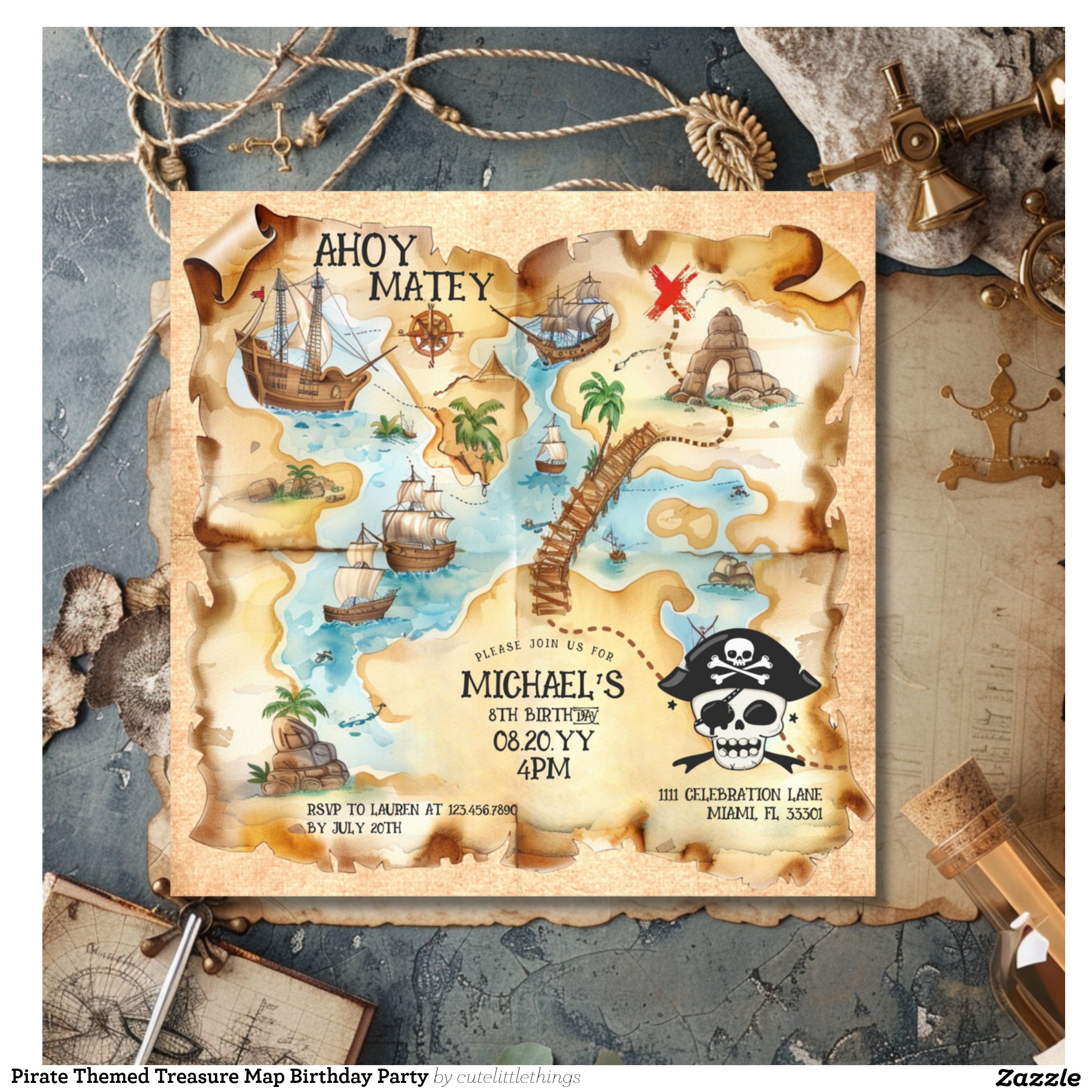 Pirate Themed Treasure Map Birthday Party Invitation