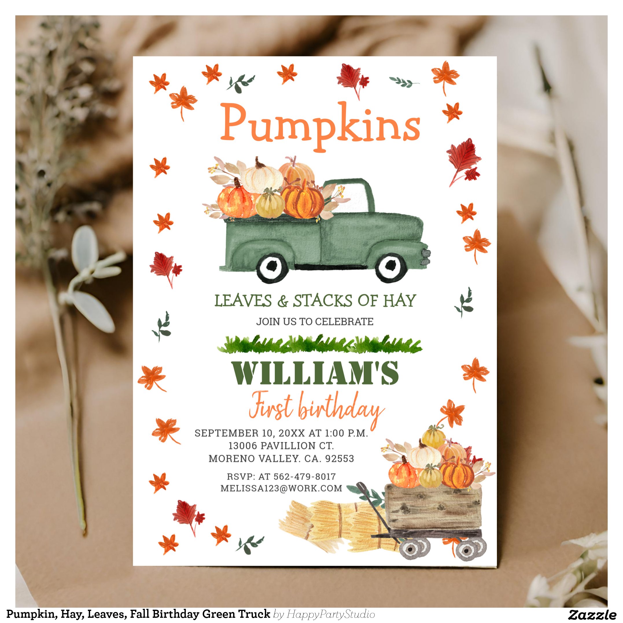 Pumpkin, Hay, Leaves, Fall Birthday Green Truck Invitation