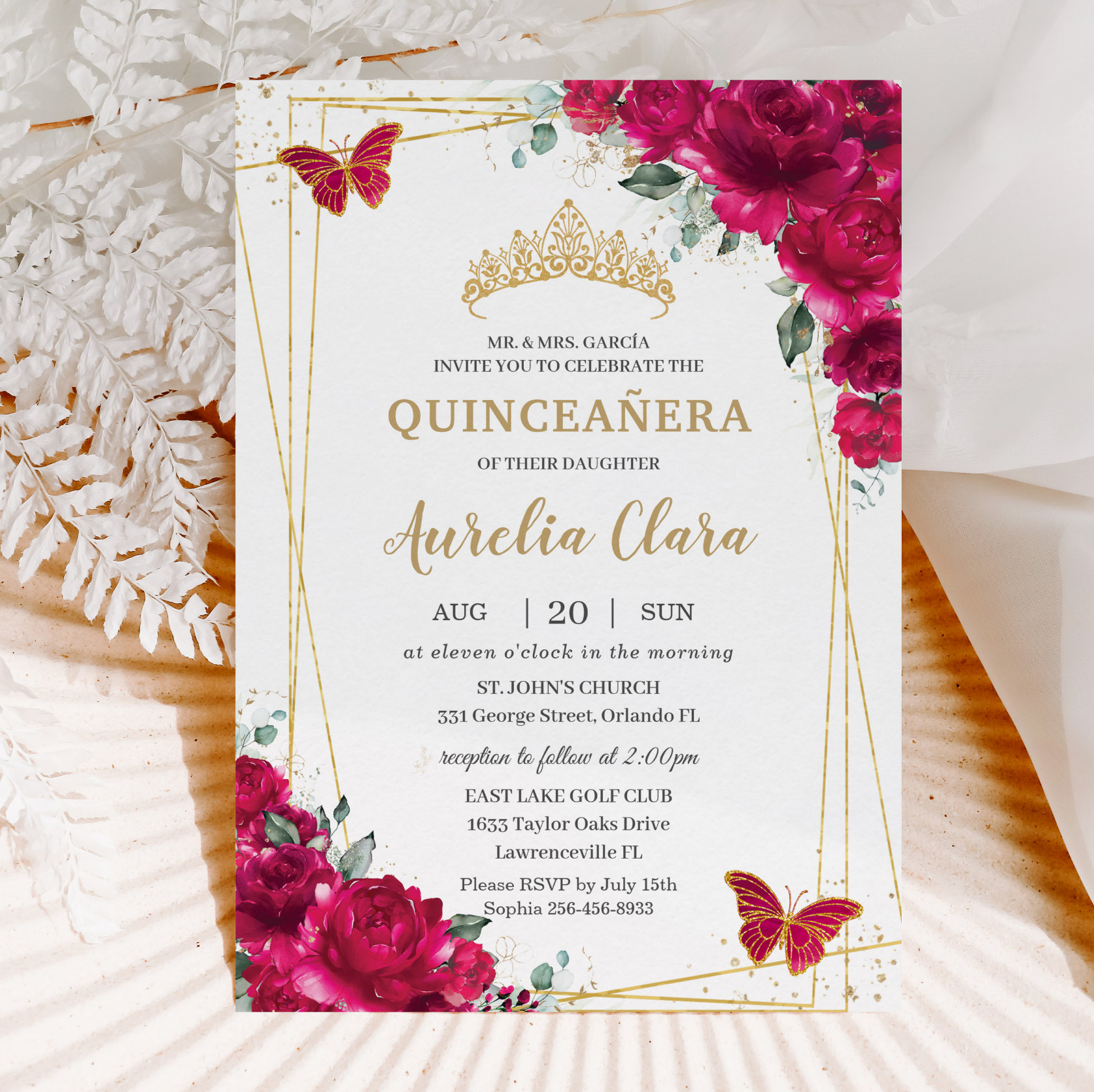Be the first to review “Quincea?era Fuchsia Pink Floral Butterflies Tiara Invitation”