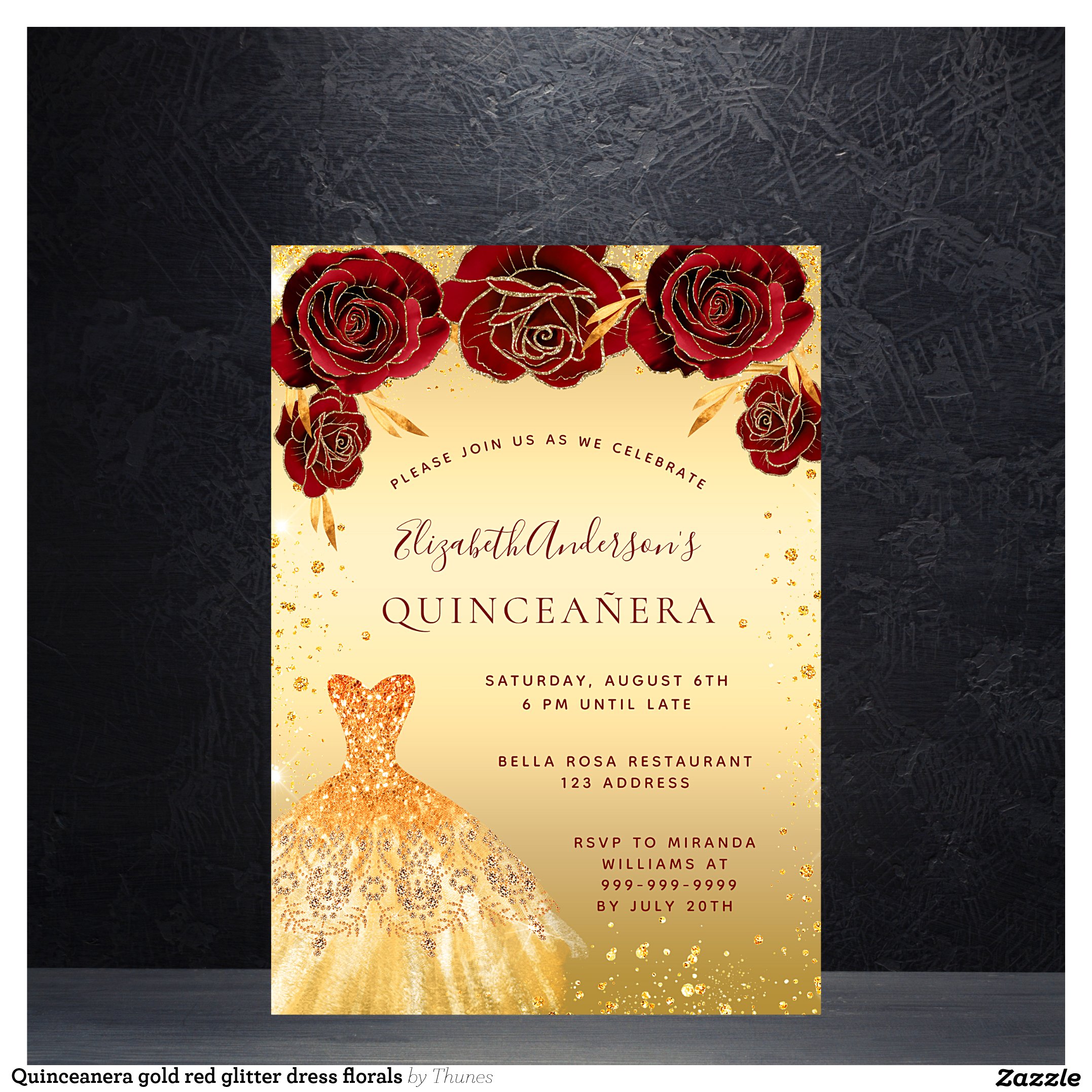 Quinceanera gold red glitter dress florals invitation
