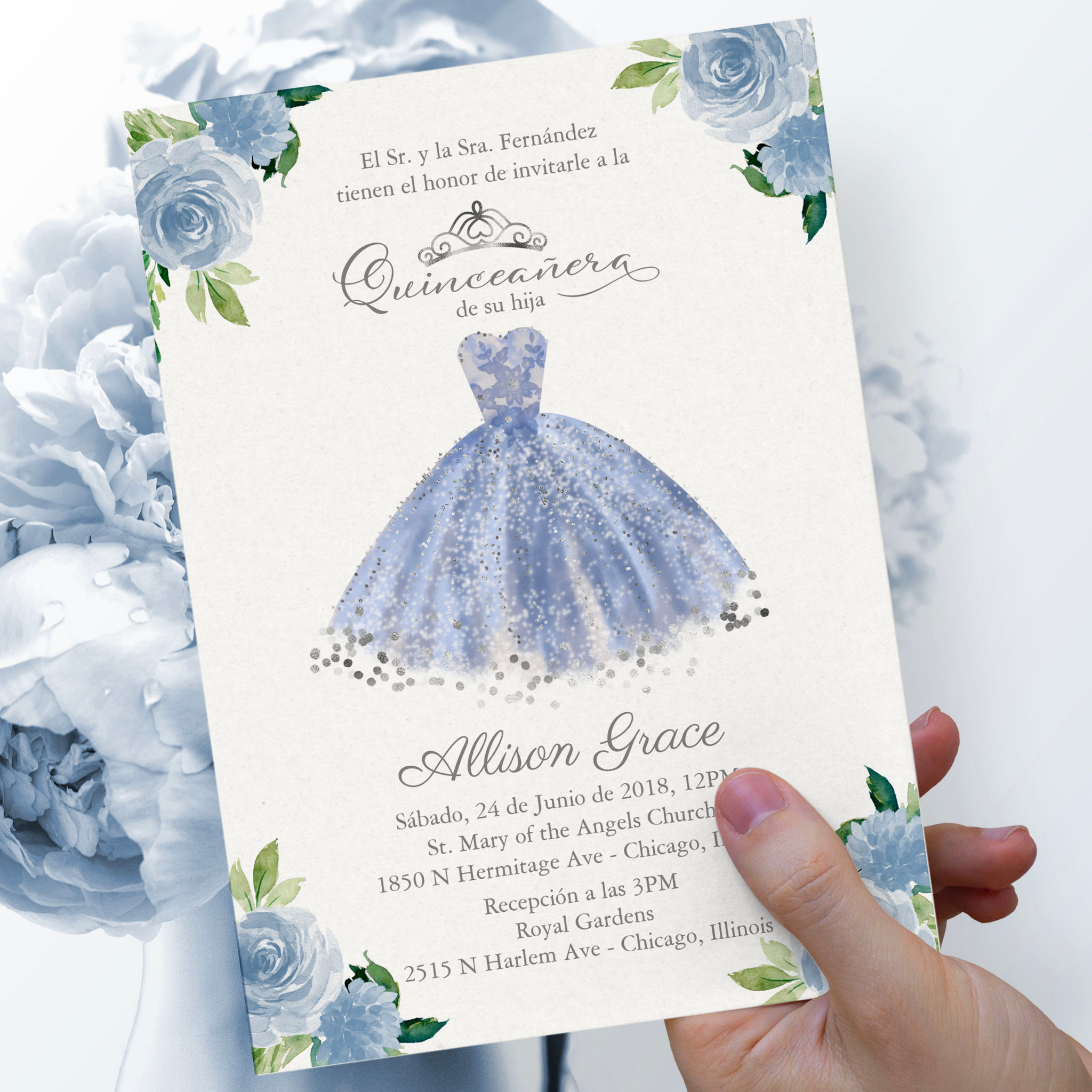 Quinceanera Invitation Spanish Blue Gown Floral