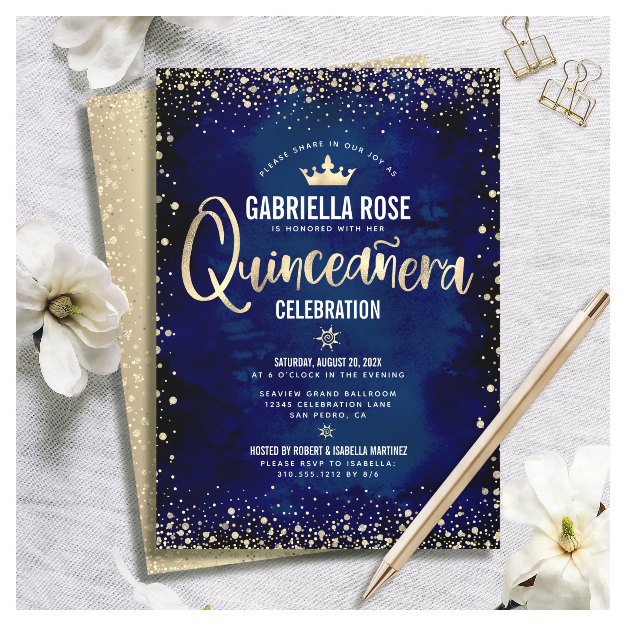 Quincea?era Navy Gold Glitter Foil Princess Crown Invitation