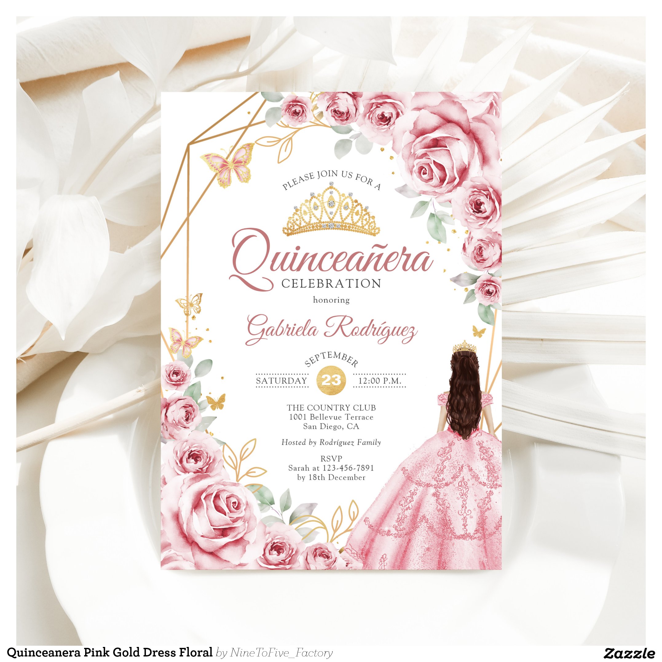 Quinceanera Pink Gold Dress Floral Invitation