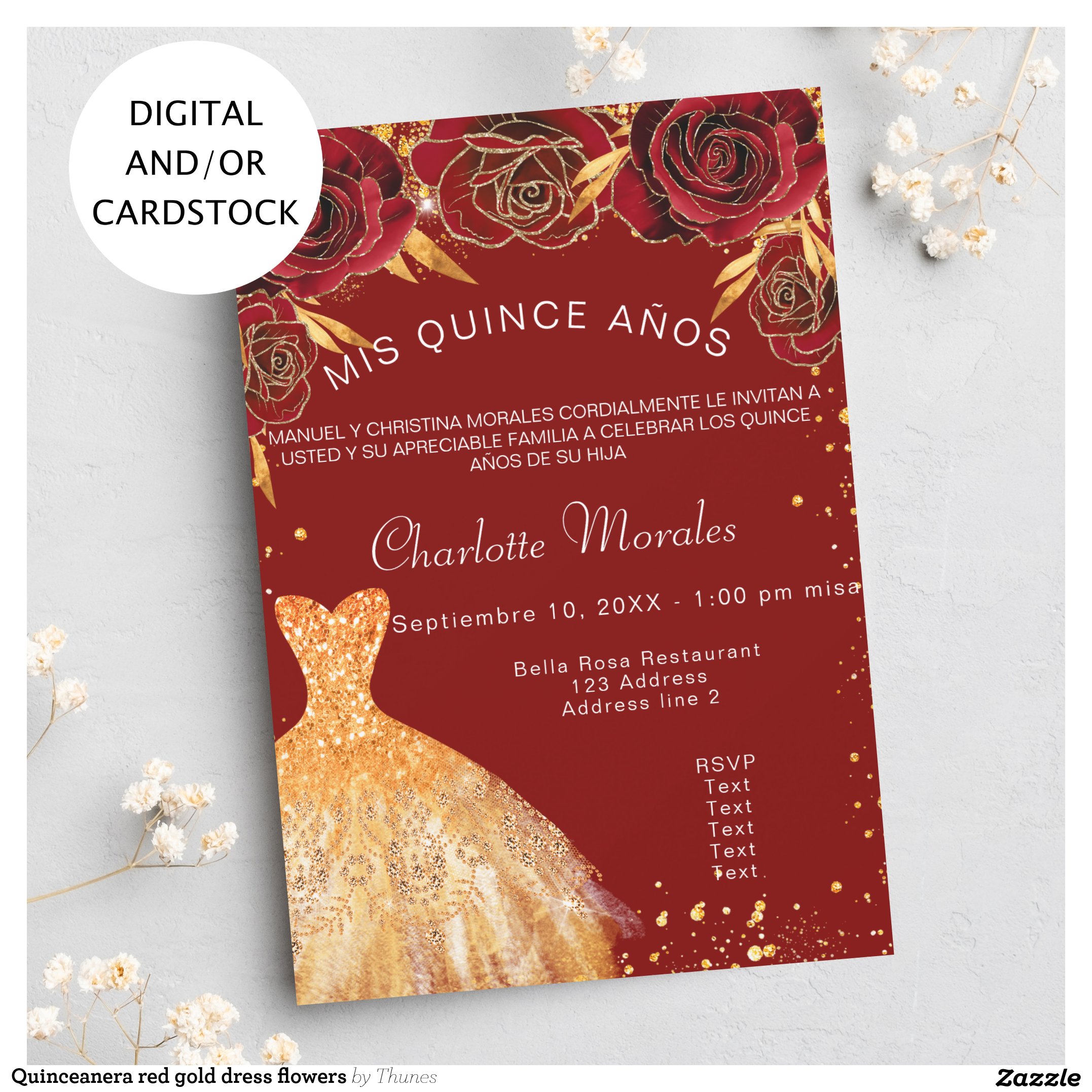 Quinceanera red gold dress flowers invitation