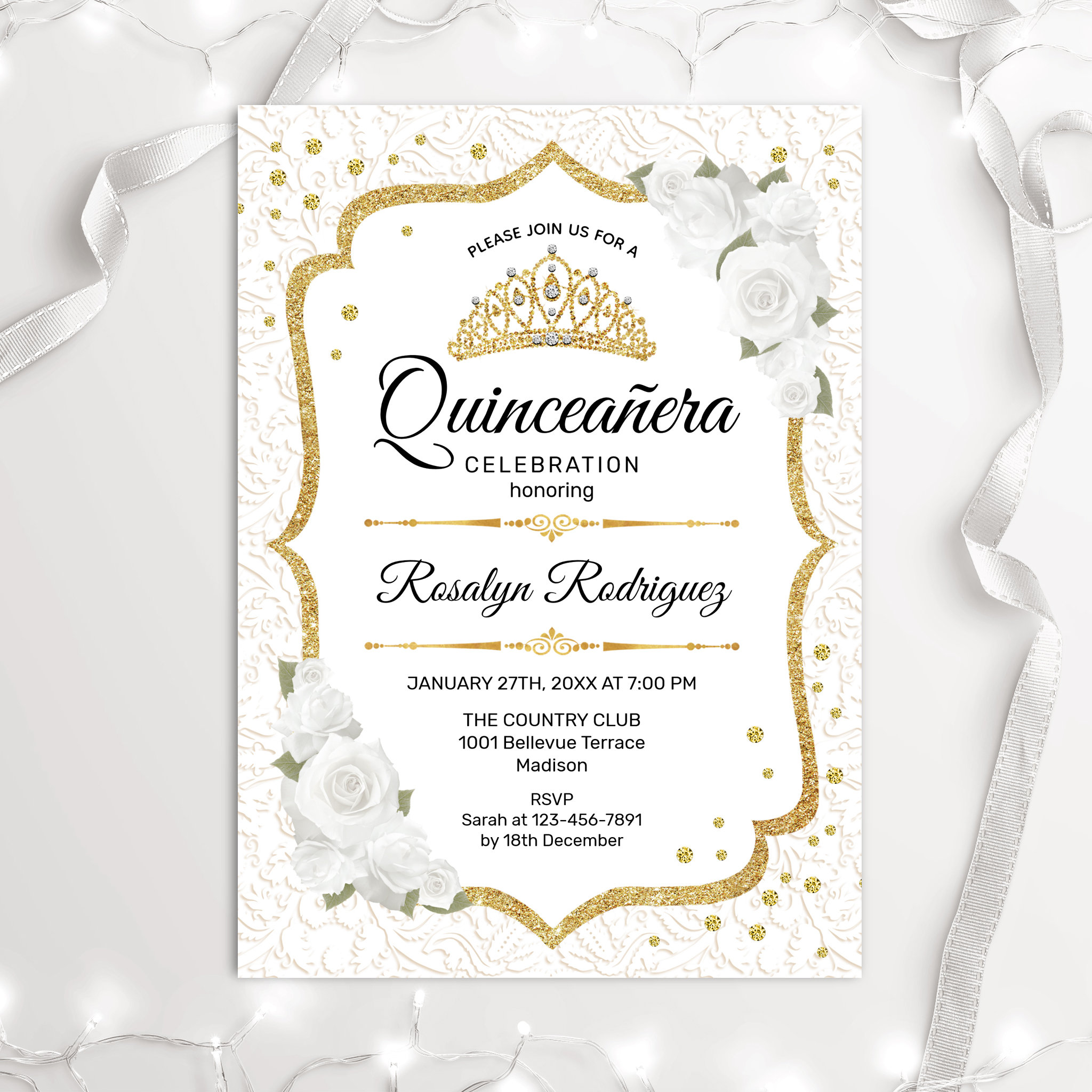 Quinceanera – White Gold Floral Invitation
