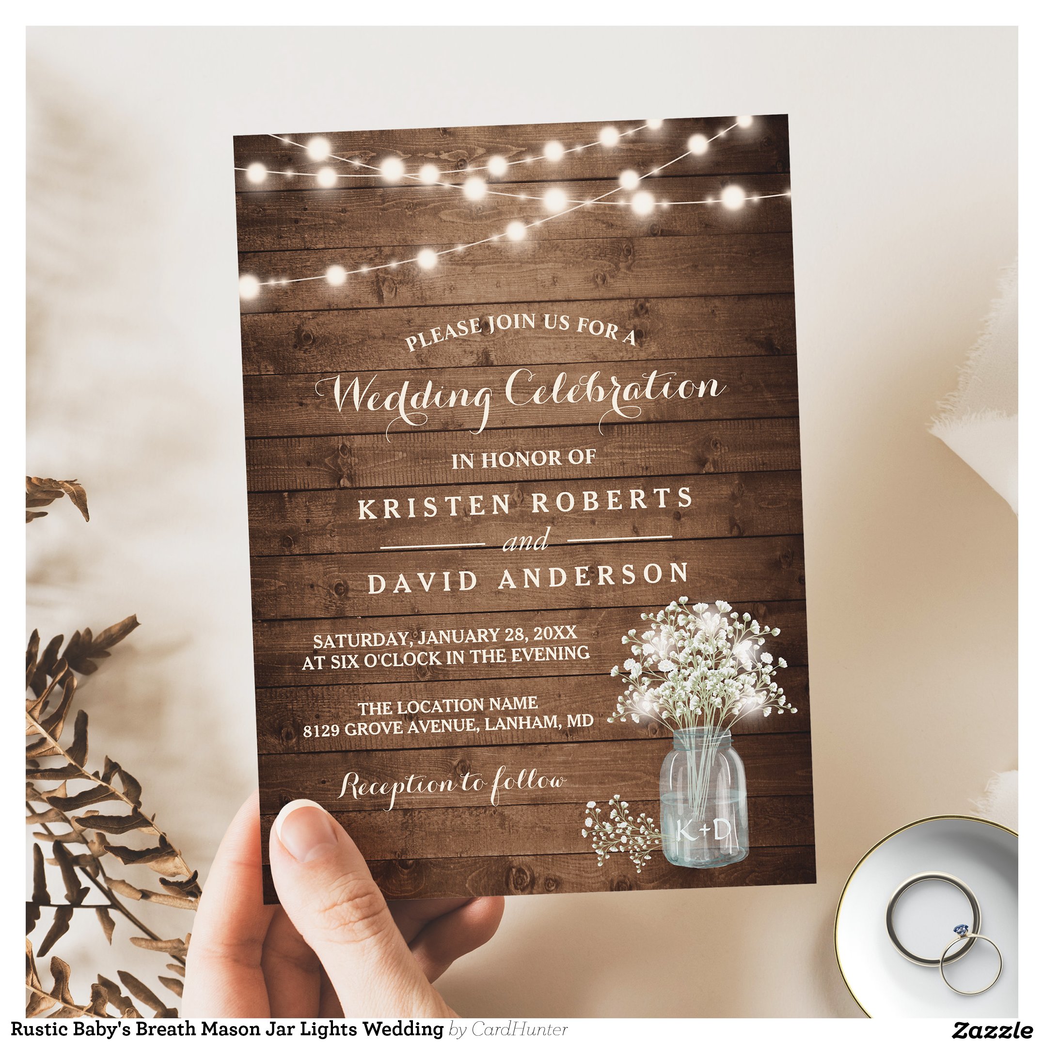 Rustic Baby’s Breath Mason Jar Lights Wedding Invitation