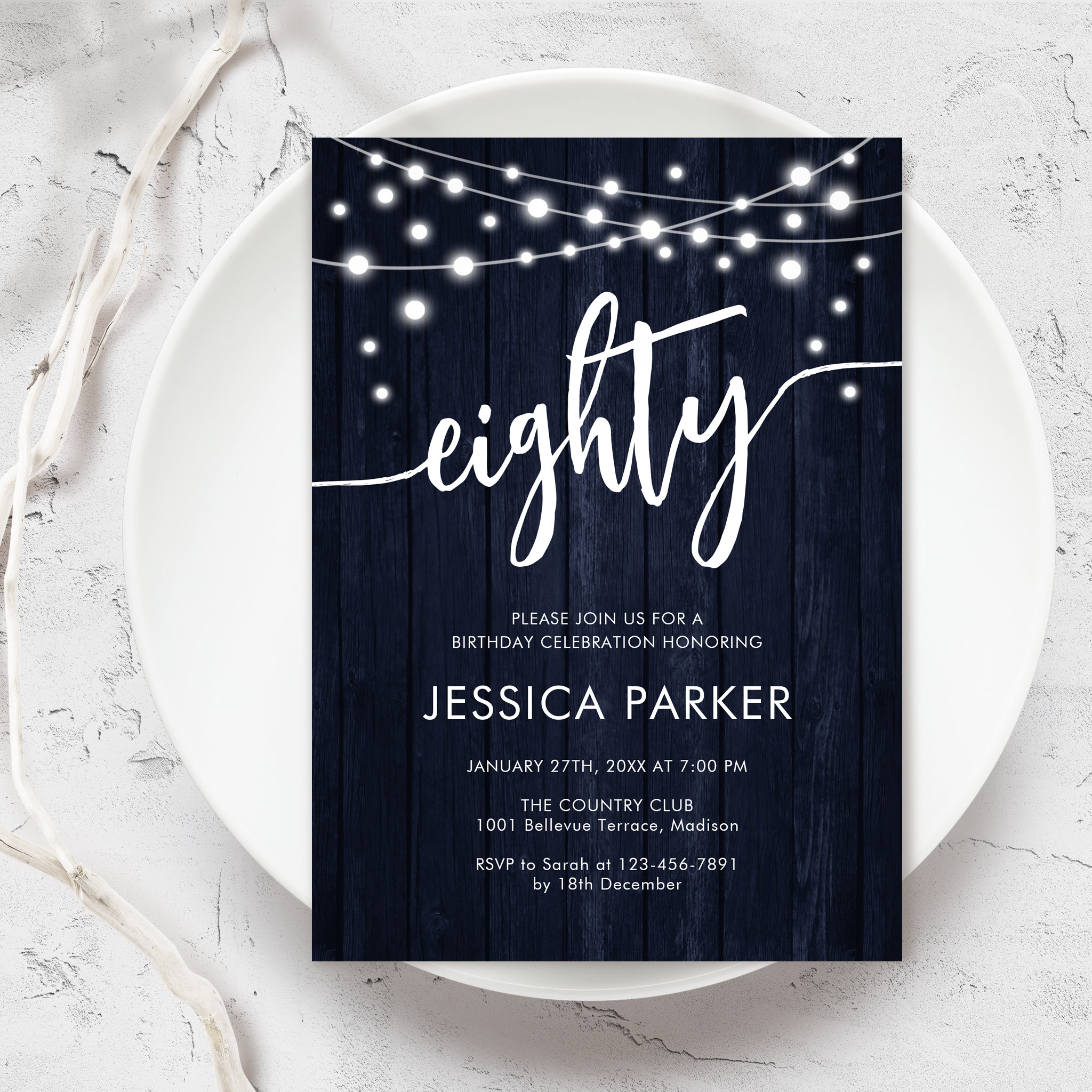 Rustic Navy 80th Birthday Party Invitation