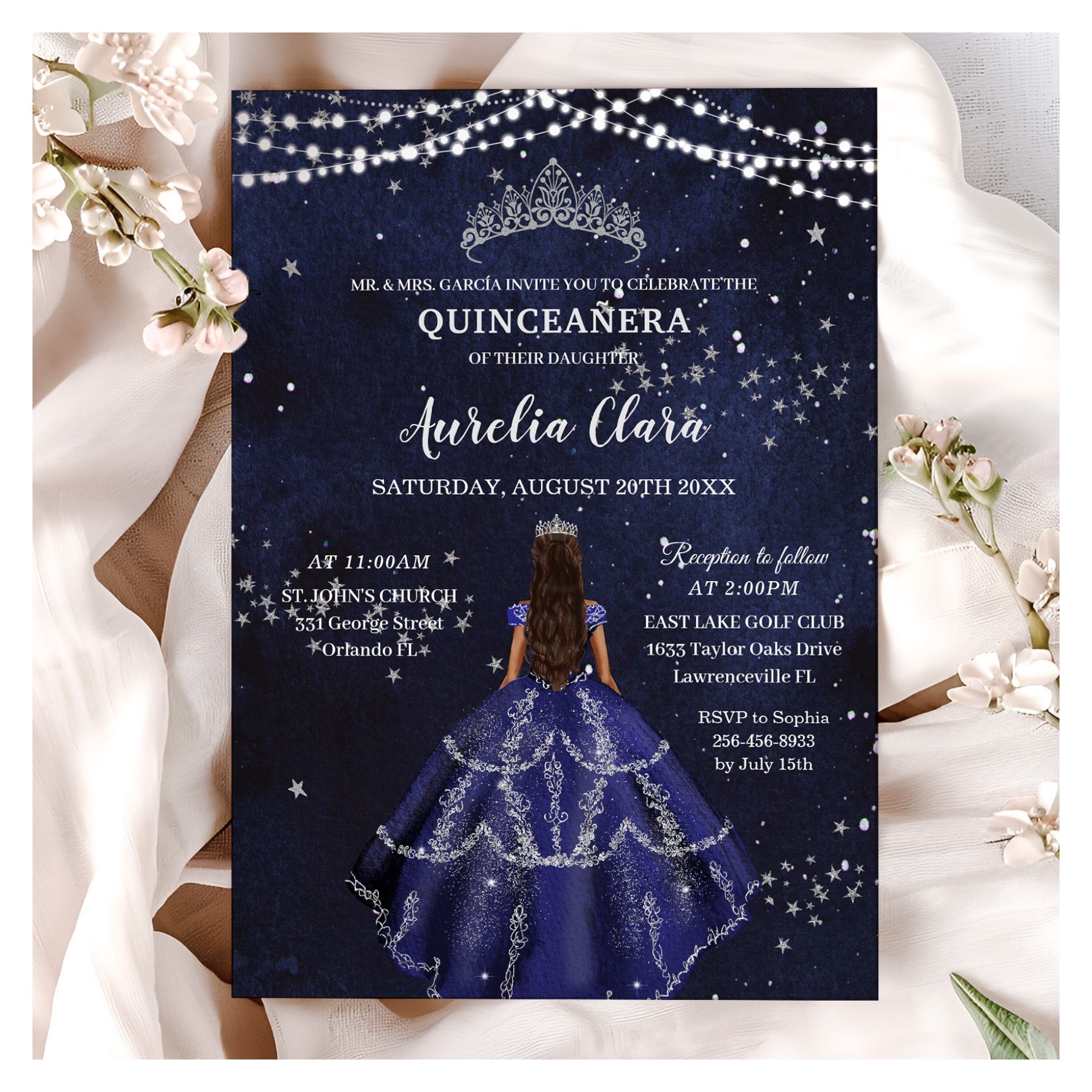 Be the first to review “Starry Night Navy Blue Dress Silver Quincea?era Invitation”