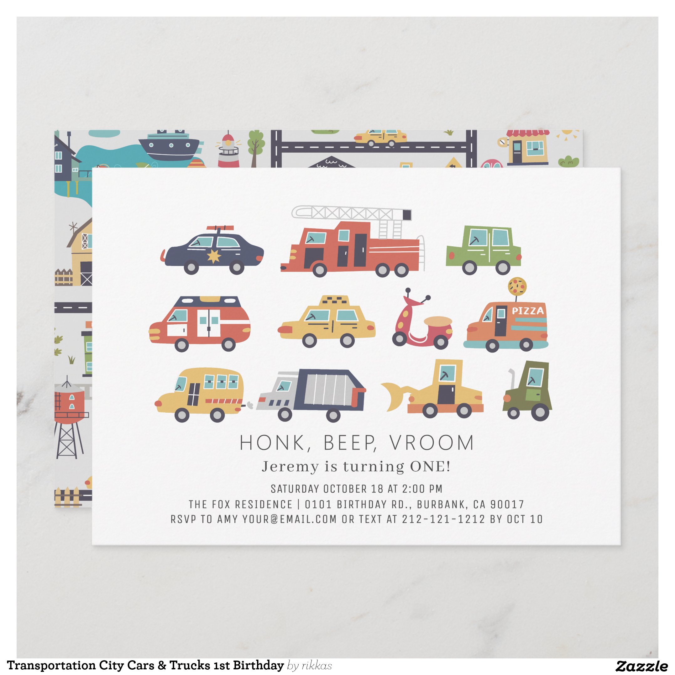 Transportation City Cars & Trucks 1st Birthday Invitation