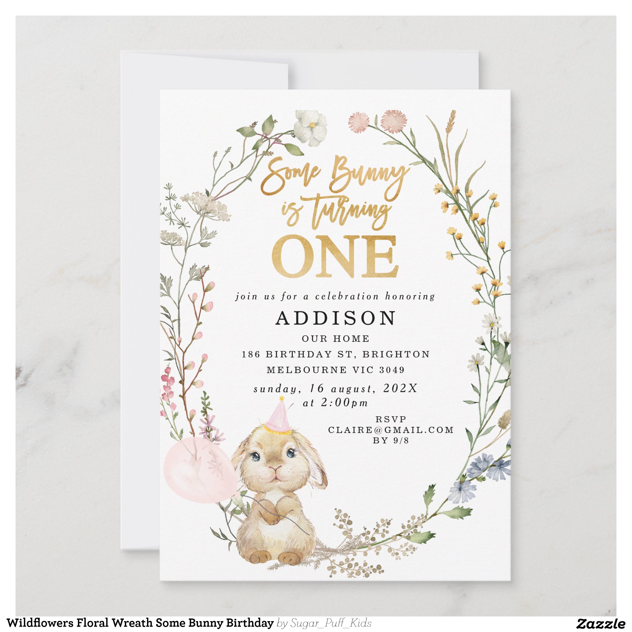 Wildflowers Floral Wreath Some Bunny Birthday Invitation